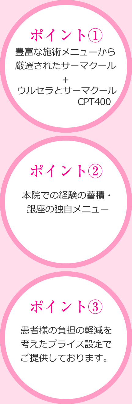 高密度焦点式の超音波を表在性筋膜(スマス)にあてリフティングします。筋層まで達するので、根本的なアプローチが可能になりました。ウルセラでは外科的手術でしか行えなかったスマスの引き上げます。